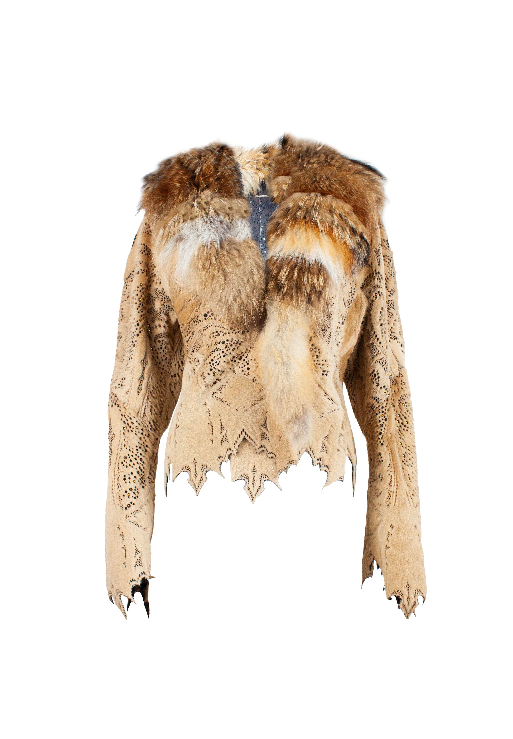 Roberto Cavalli Fox collar, laser cut bodice fur coat with diamond decoration